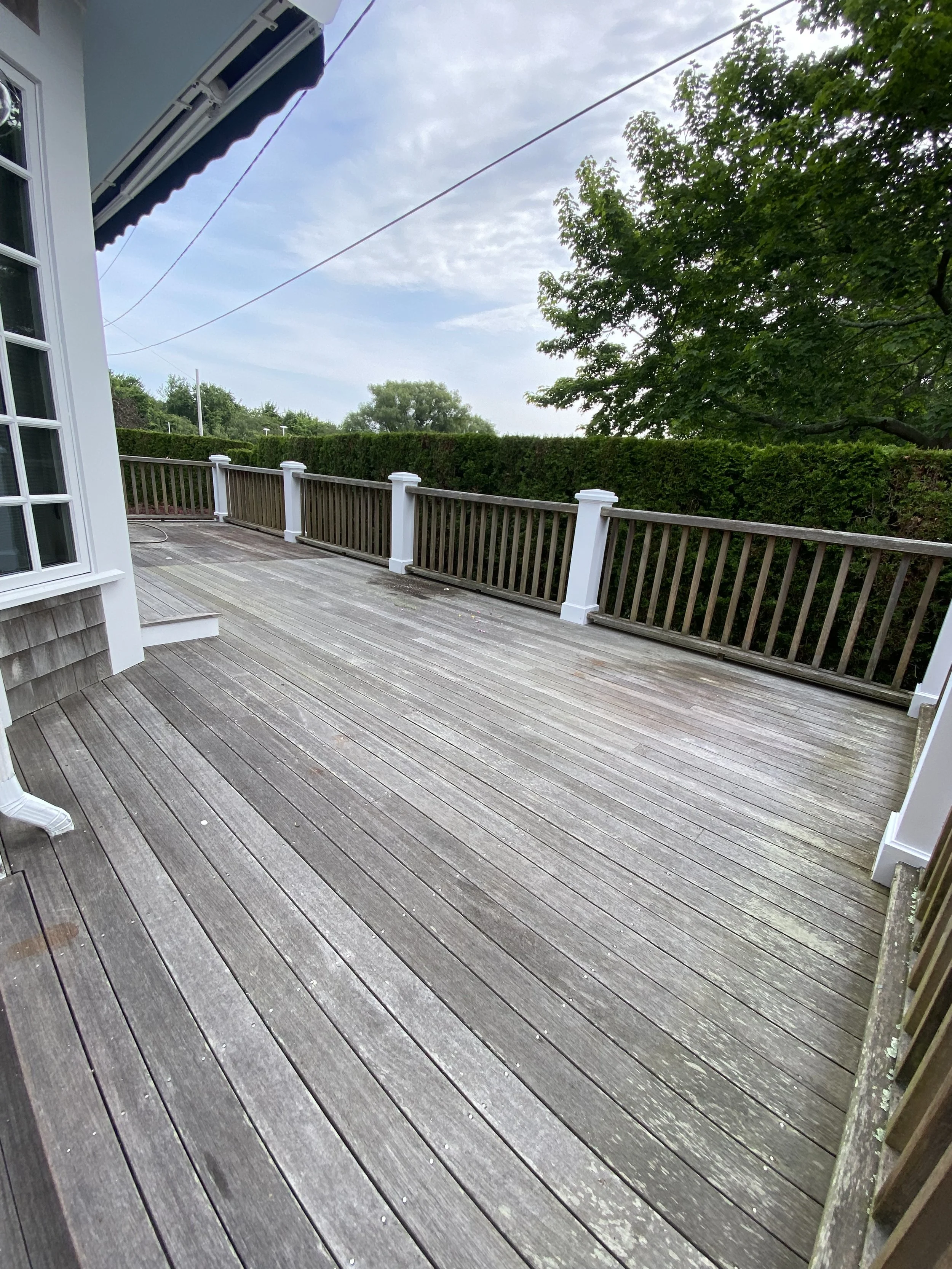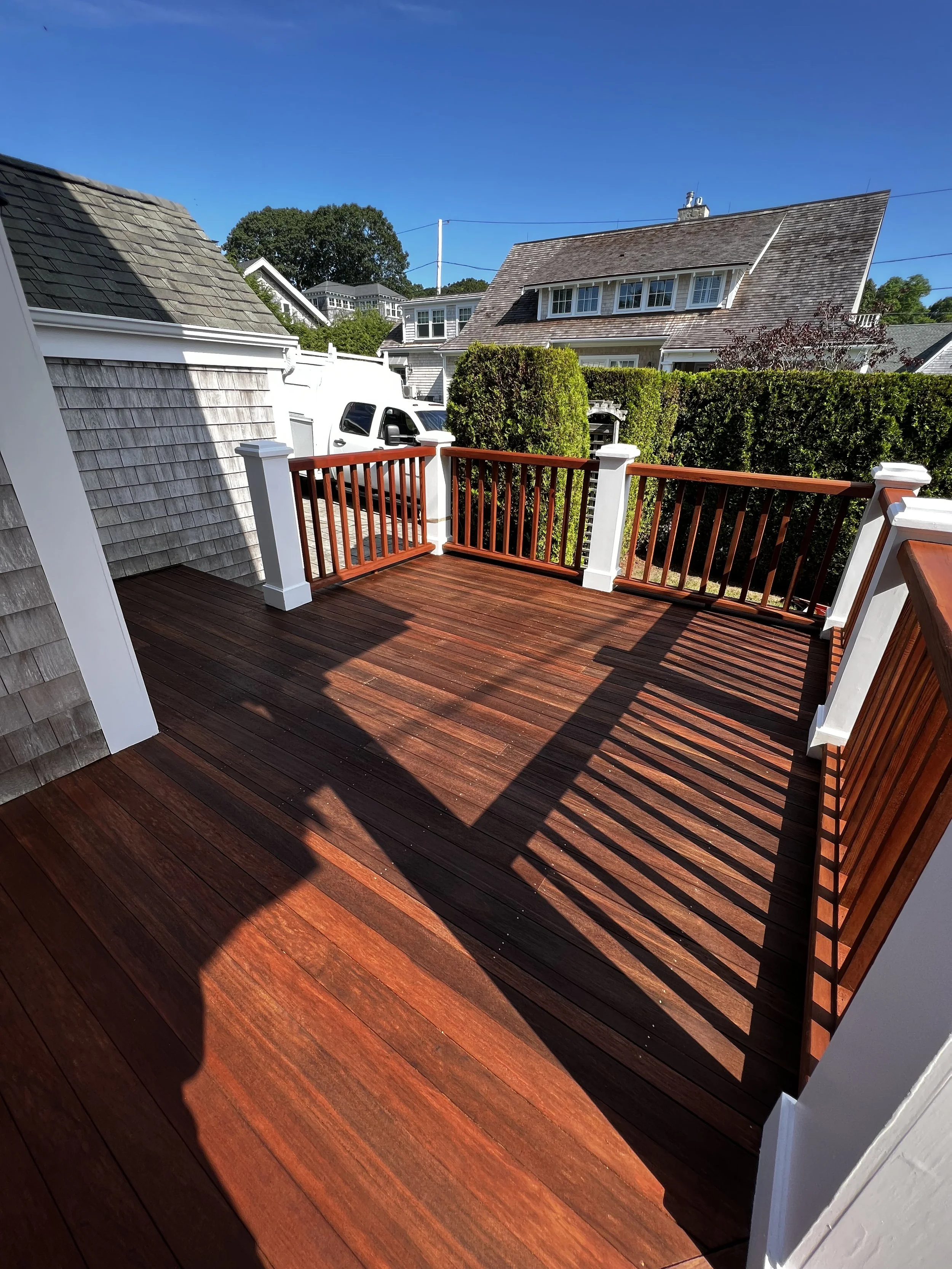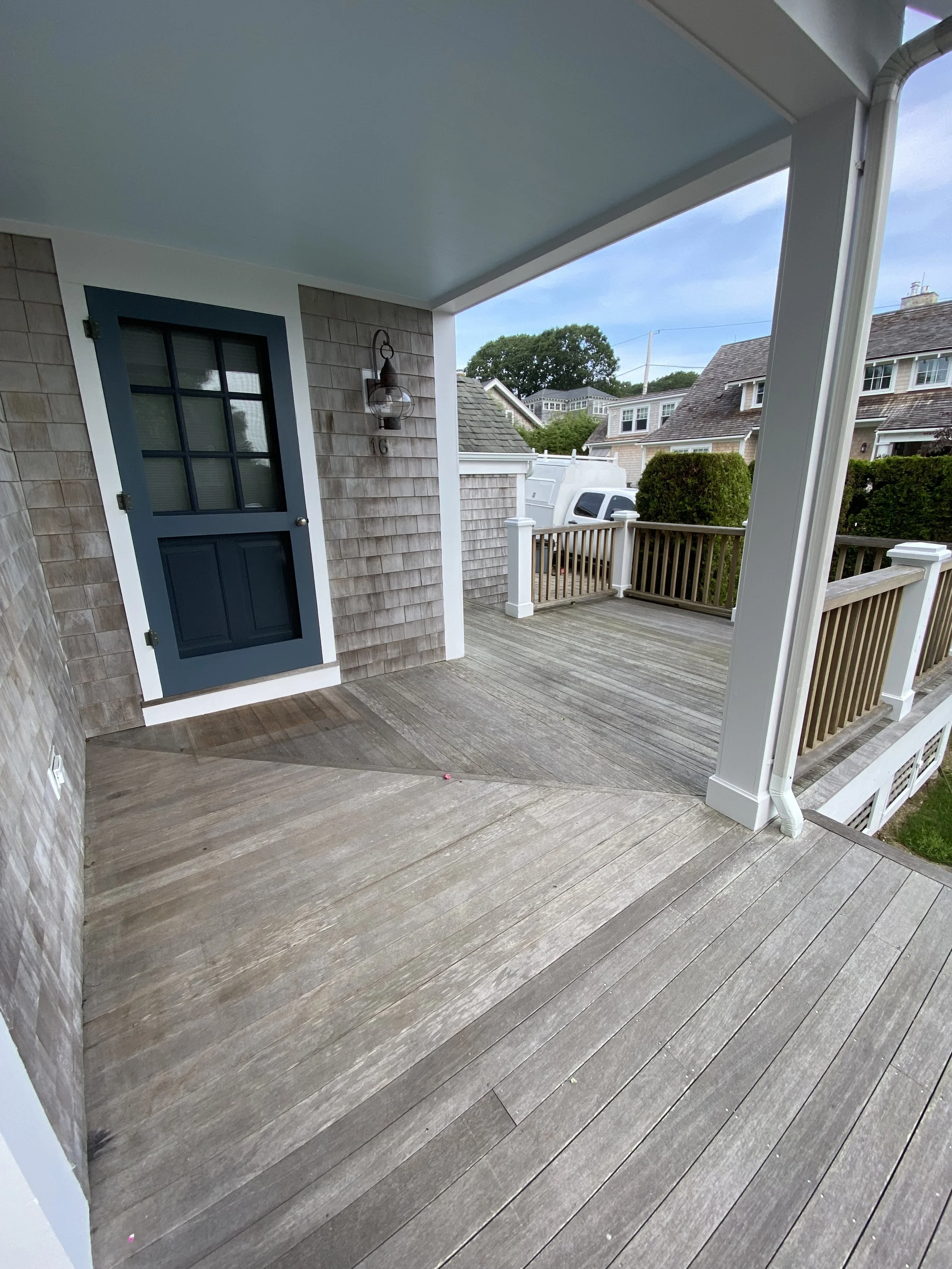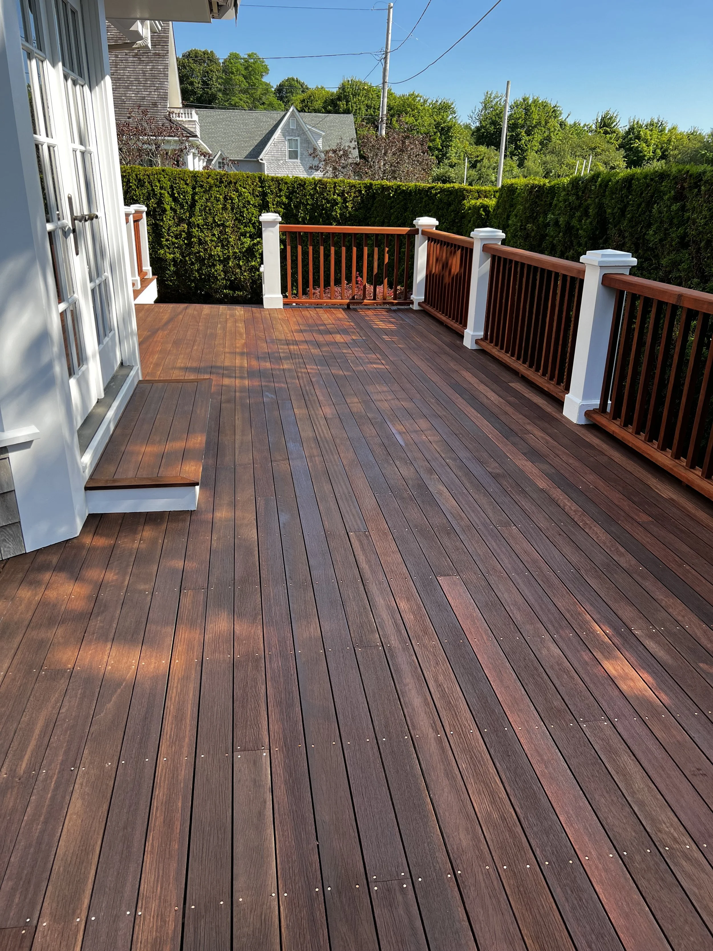 This deck has held up well over the years but was in need of some tlc. To start we scrubbed and washed all surfaces with sodium metasilicate and brightened with oxalic acid. All surfaces were sanded to 80 grit and Armstrong Clarke Stain in mahogany tone was applied.