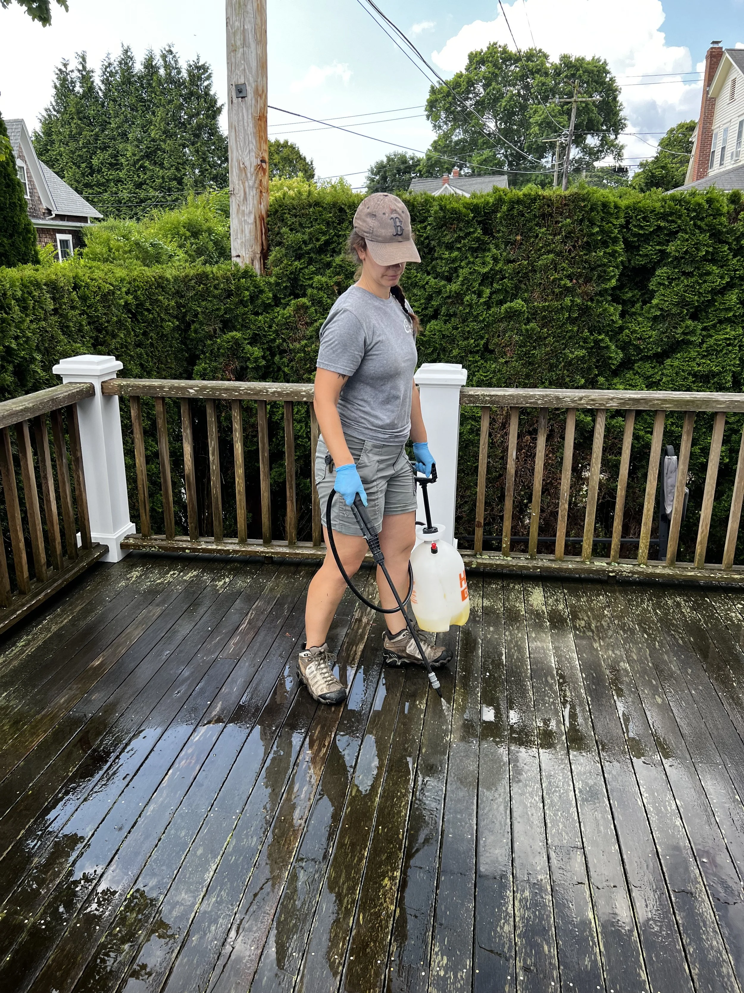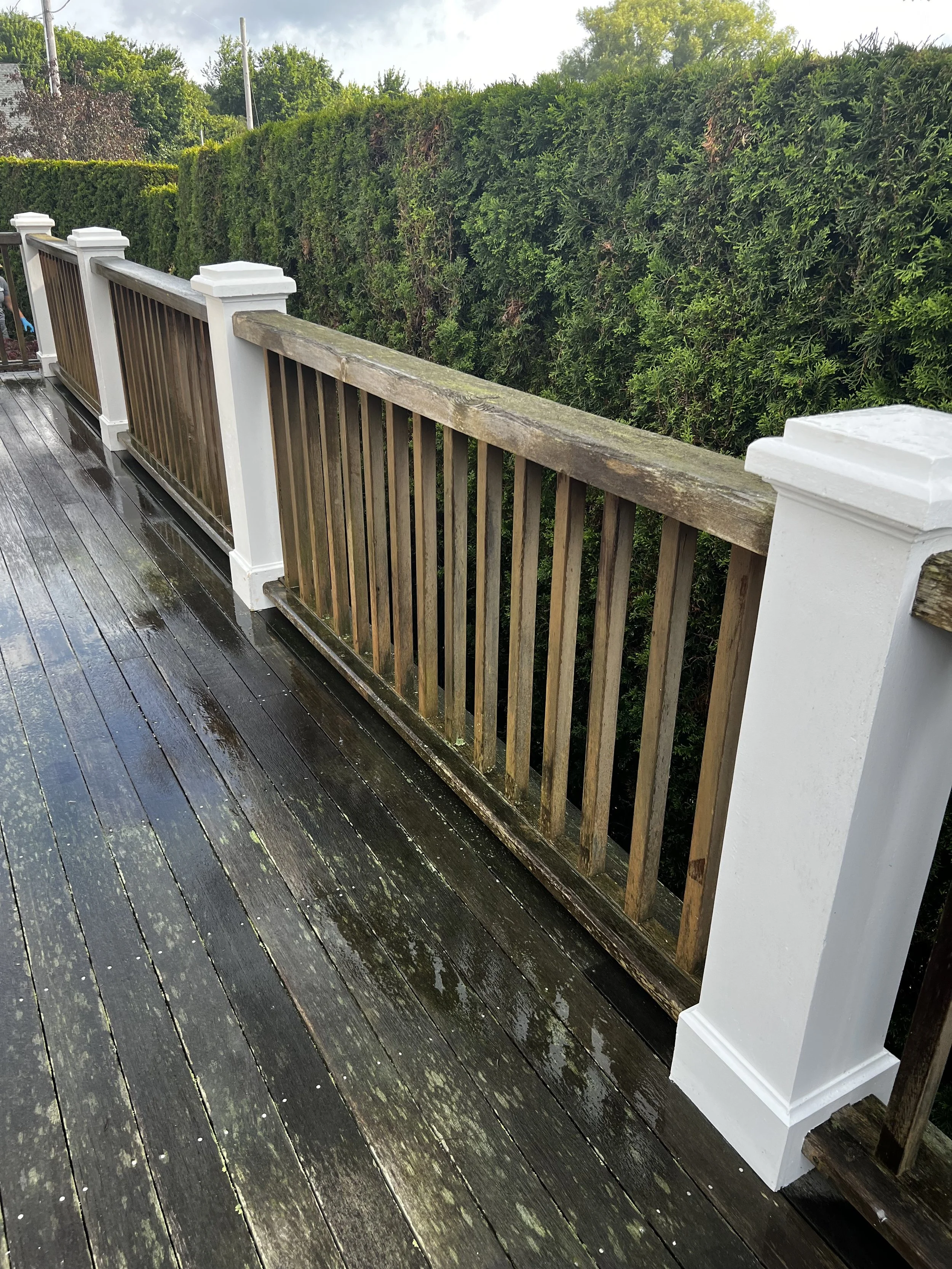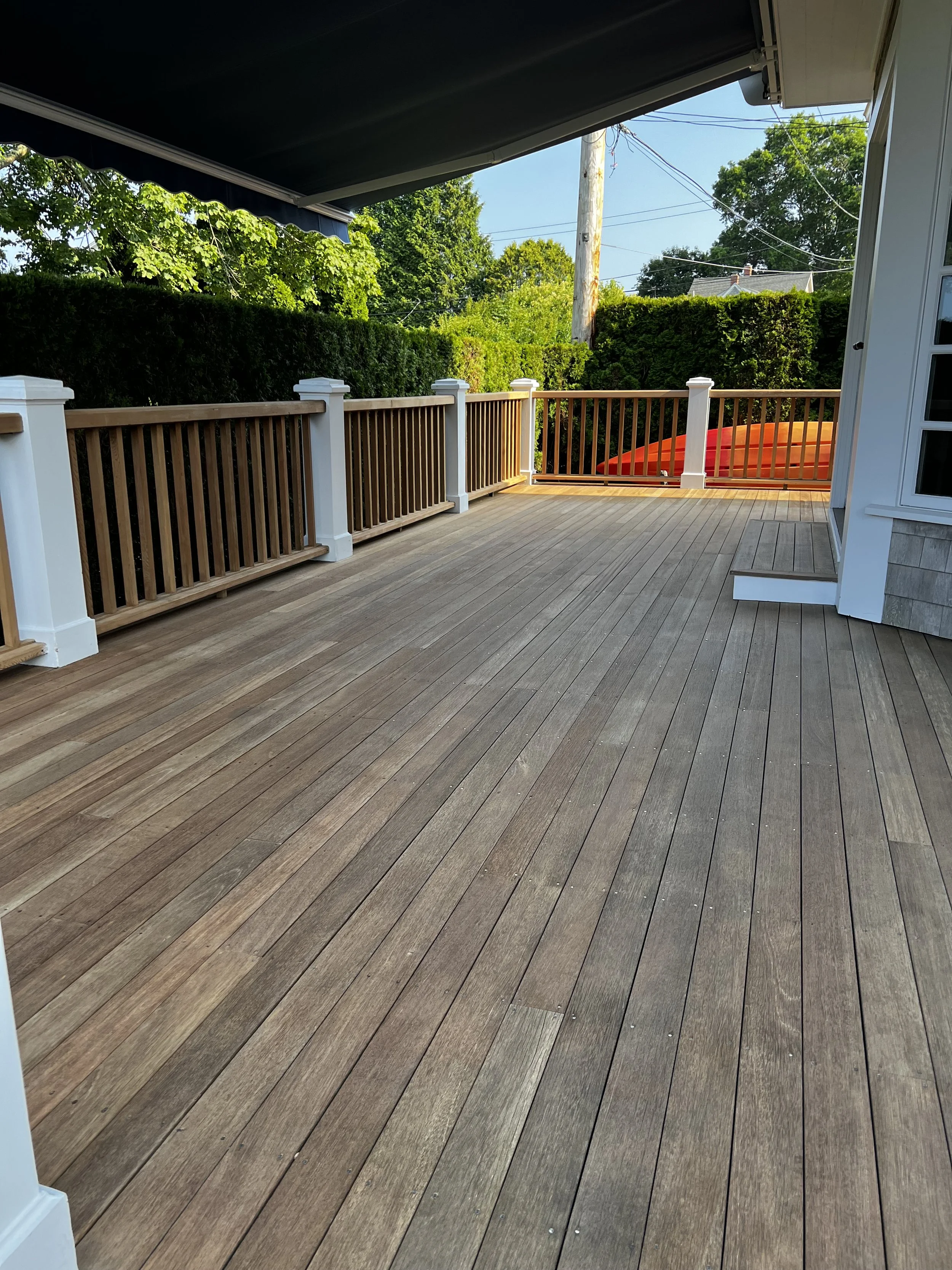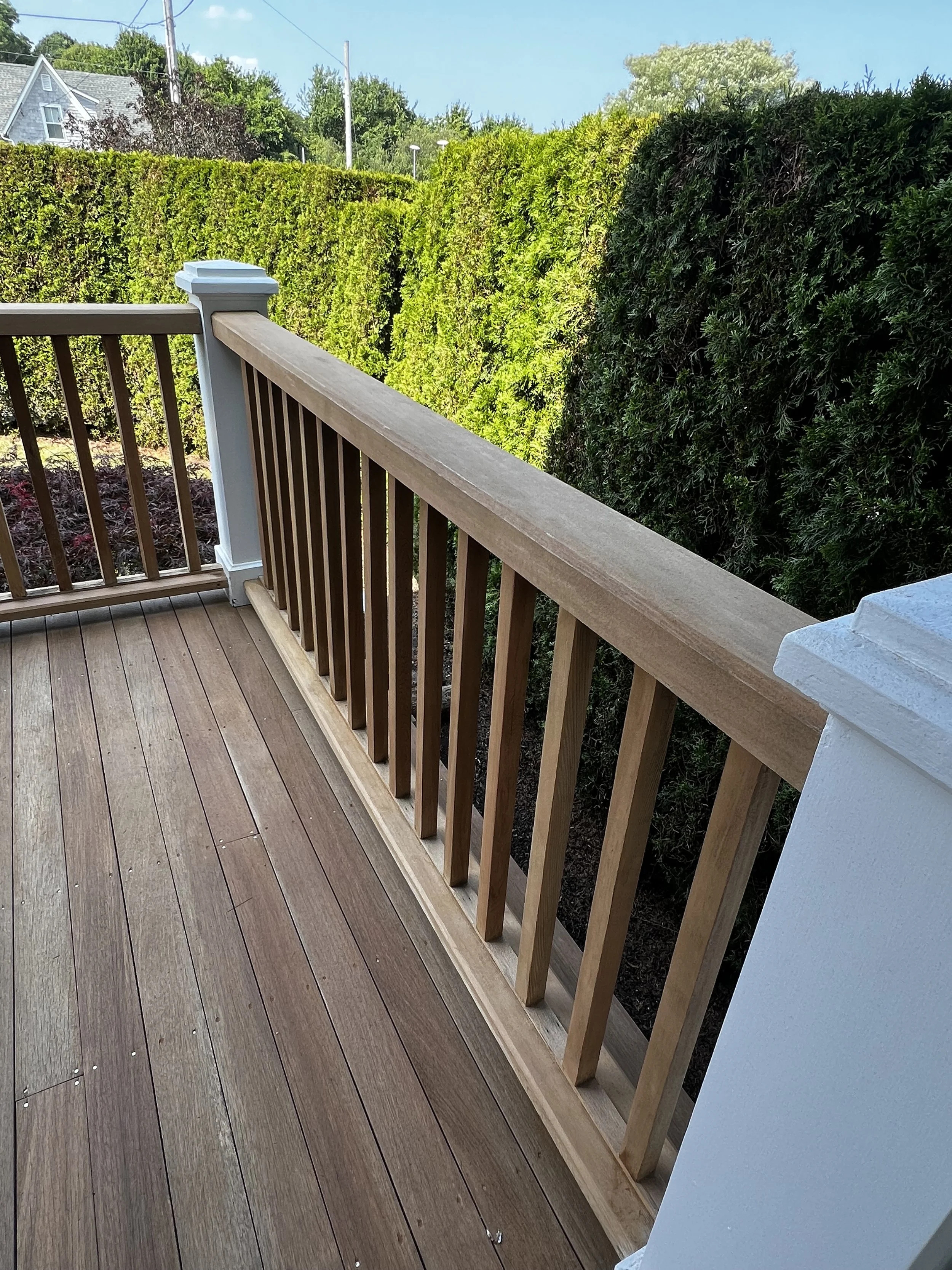 This deck has held up well over the years but was in need of some tlc. To start we scrubbed and washed all surfaces with sodium metasilicate and brightened with oxalic acid. All surfaces were sanded to 80 grit and Armstrong Clarke Stain in mahogany tone was applied.