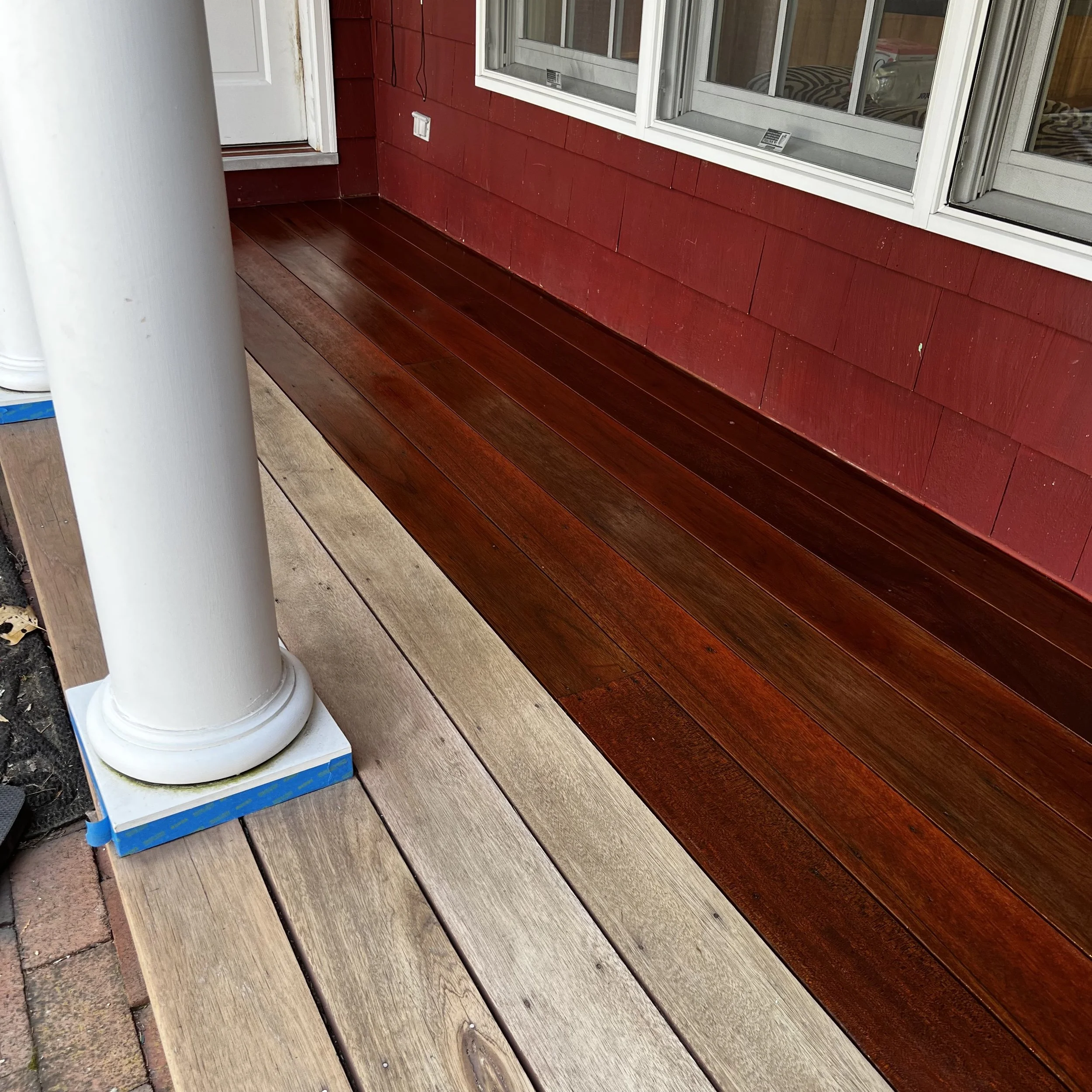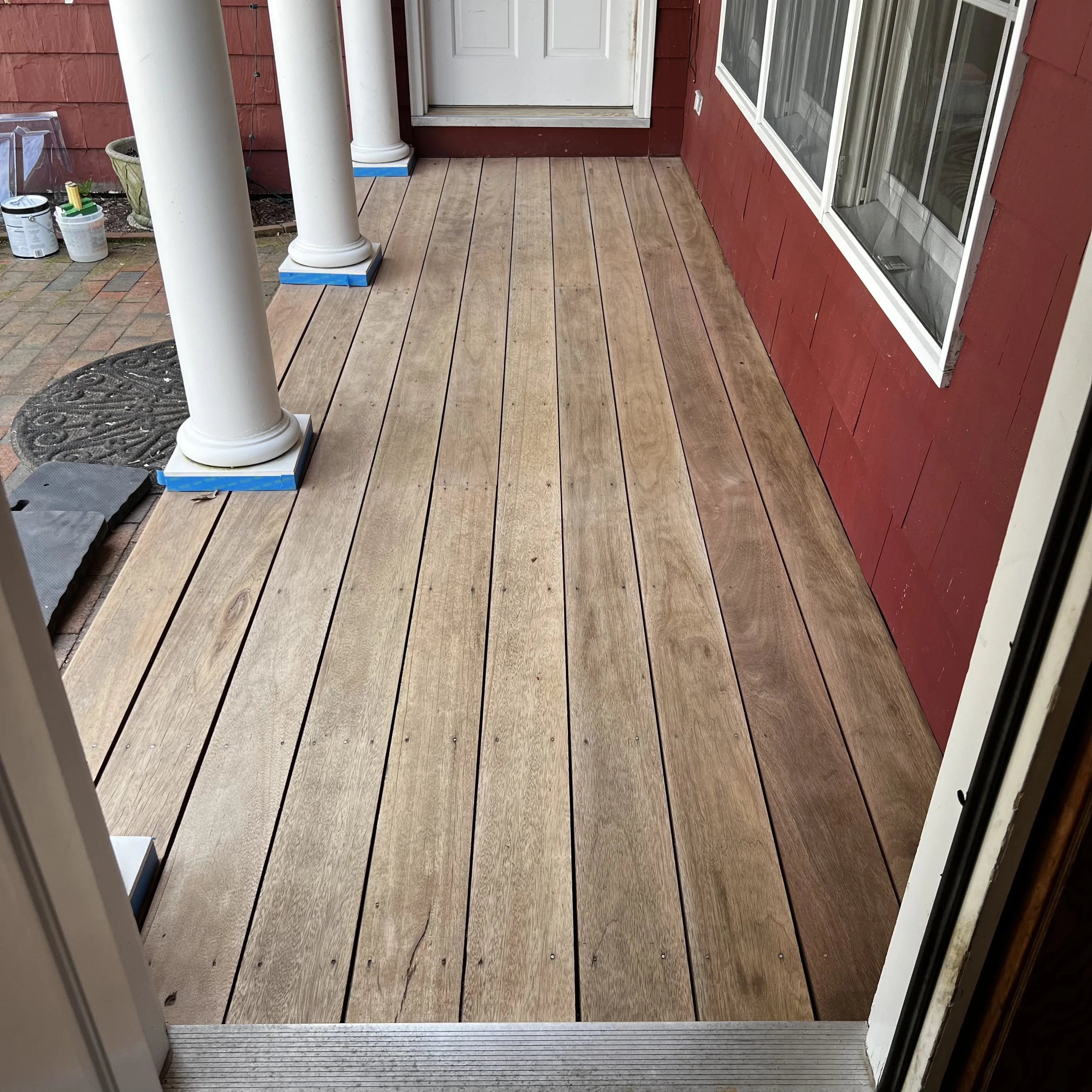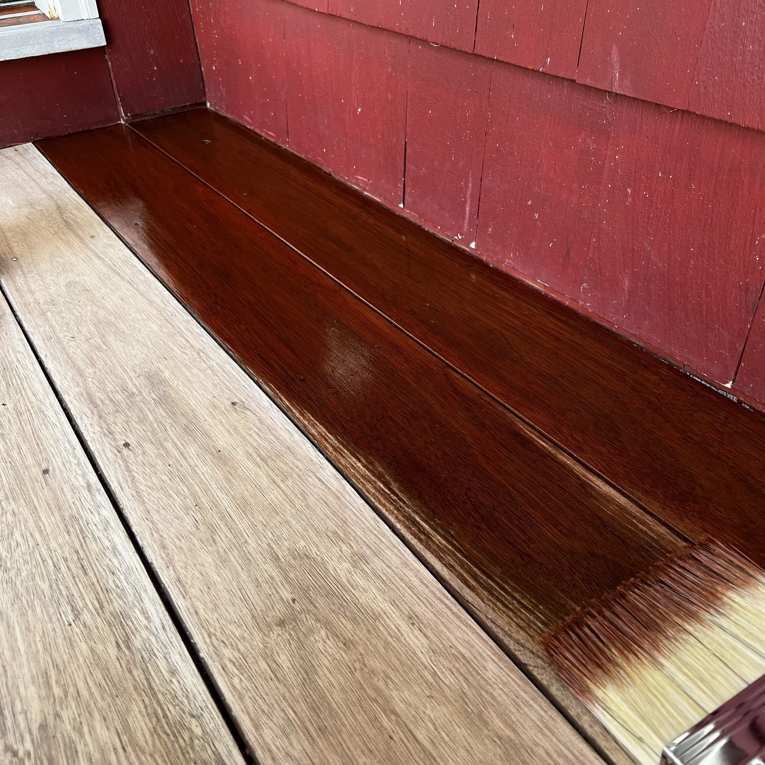 This Mahogany Deck was previously coated with a film forming deck paint. Mahogany is a hardwood that requires a specific stain that will both rehydrate the wood and provide protection. An oil based stain such as Armstrong Clarke Mahogany deck stain is perfectly suited to the task. Removing a failed film forming stain is a laborious process. In some circumstances a stripper agent is required to remove stubborn coatings. In this case only sanding was required, our festool rotex sander made the task a bit easier to accomplish.