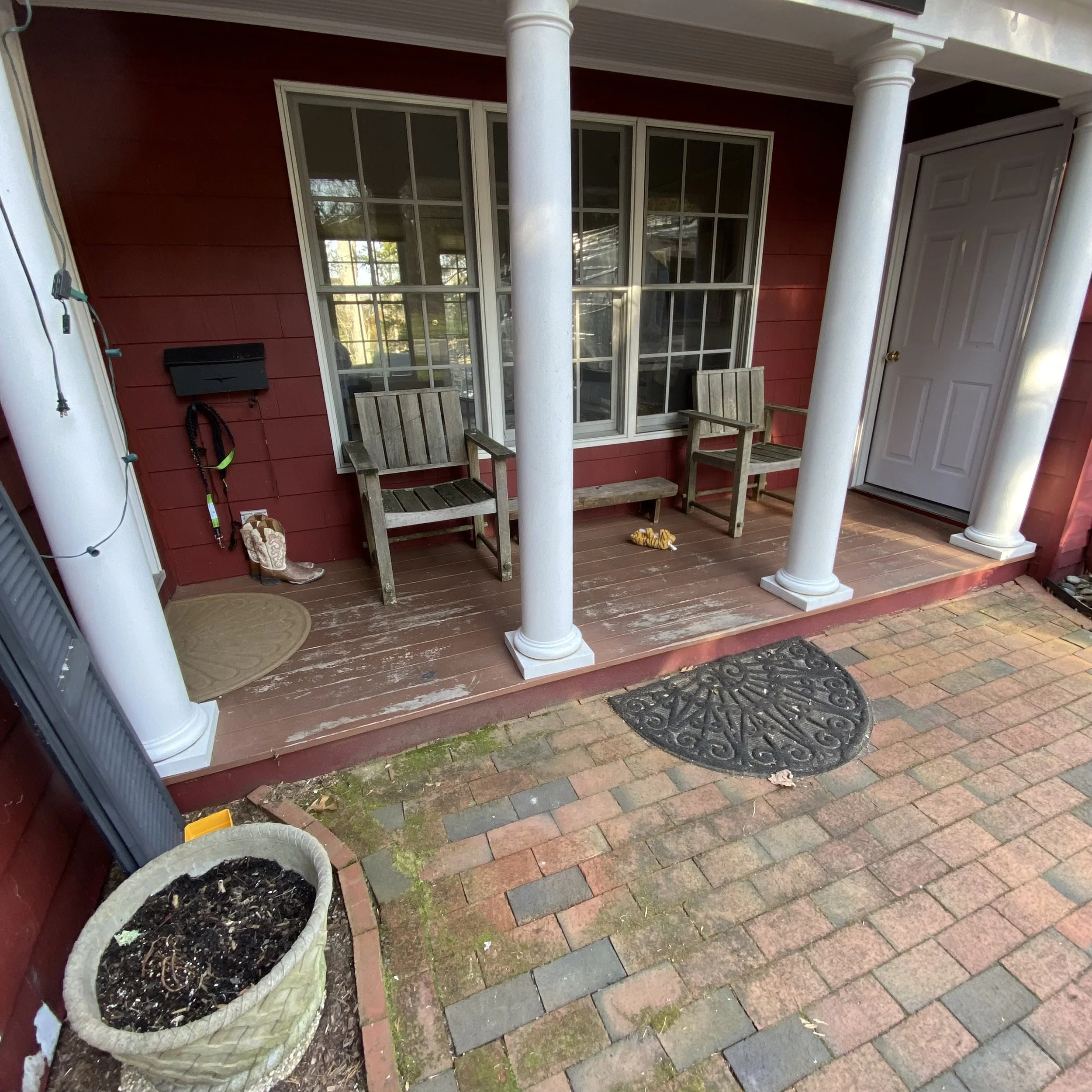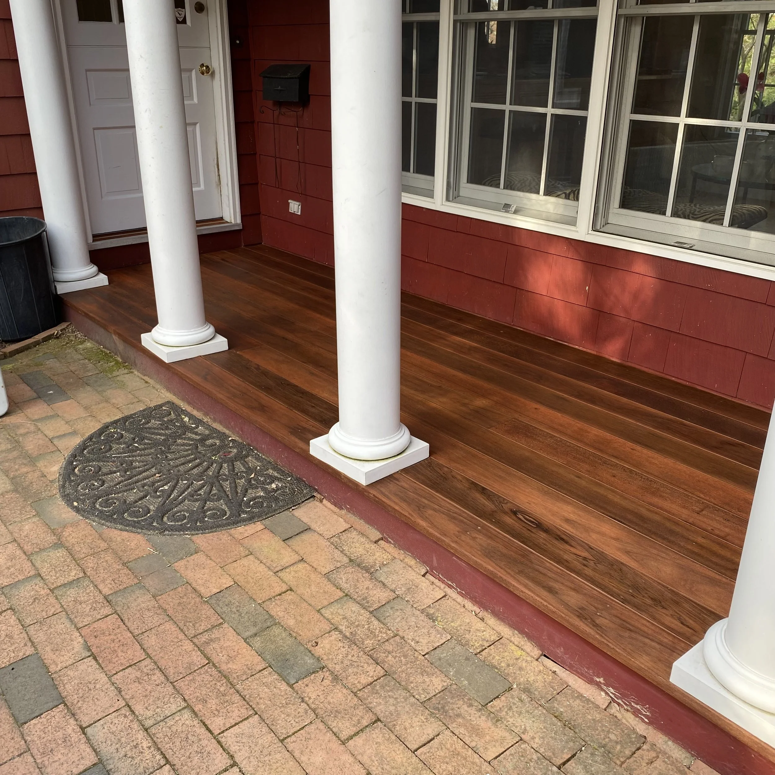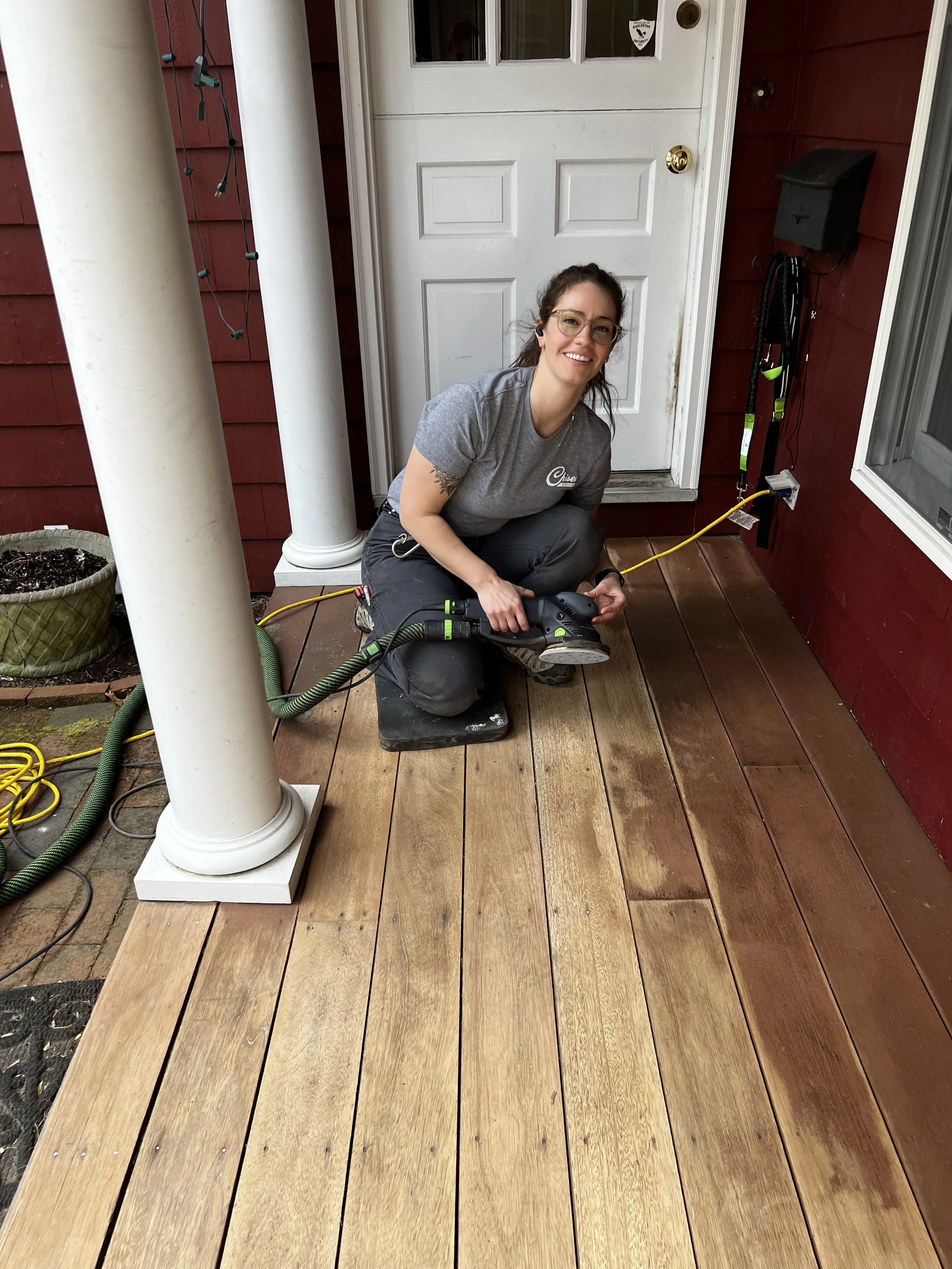 This Mahogany Deck was previously coated with a film forming deck paint. Mahogany is a hardwood that requires a specific stain that will both rehydrate the wood and provide protection. An oil based stain such as Armstrong Clarke Mahogany deck stain is perfectly suited to the task. Removing a failed film forming stain is a laborious process. In some circumstances a stripper agent is required to remove stubborn coatings. In this case only sanding was required, our festool rotex sander made the task a bit easier to accomplish.
