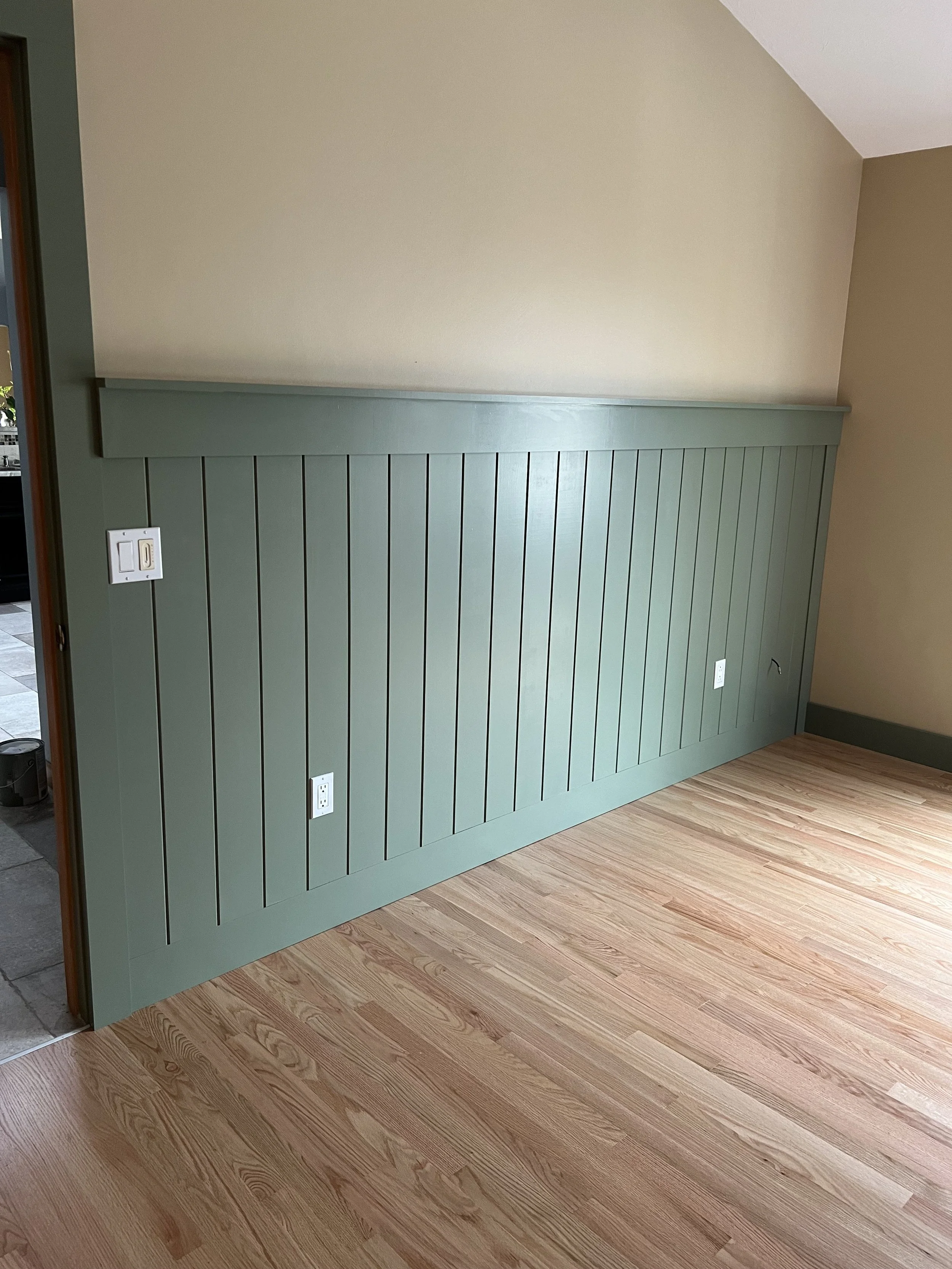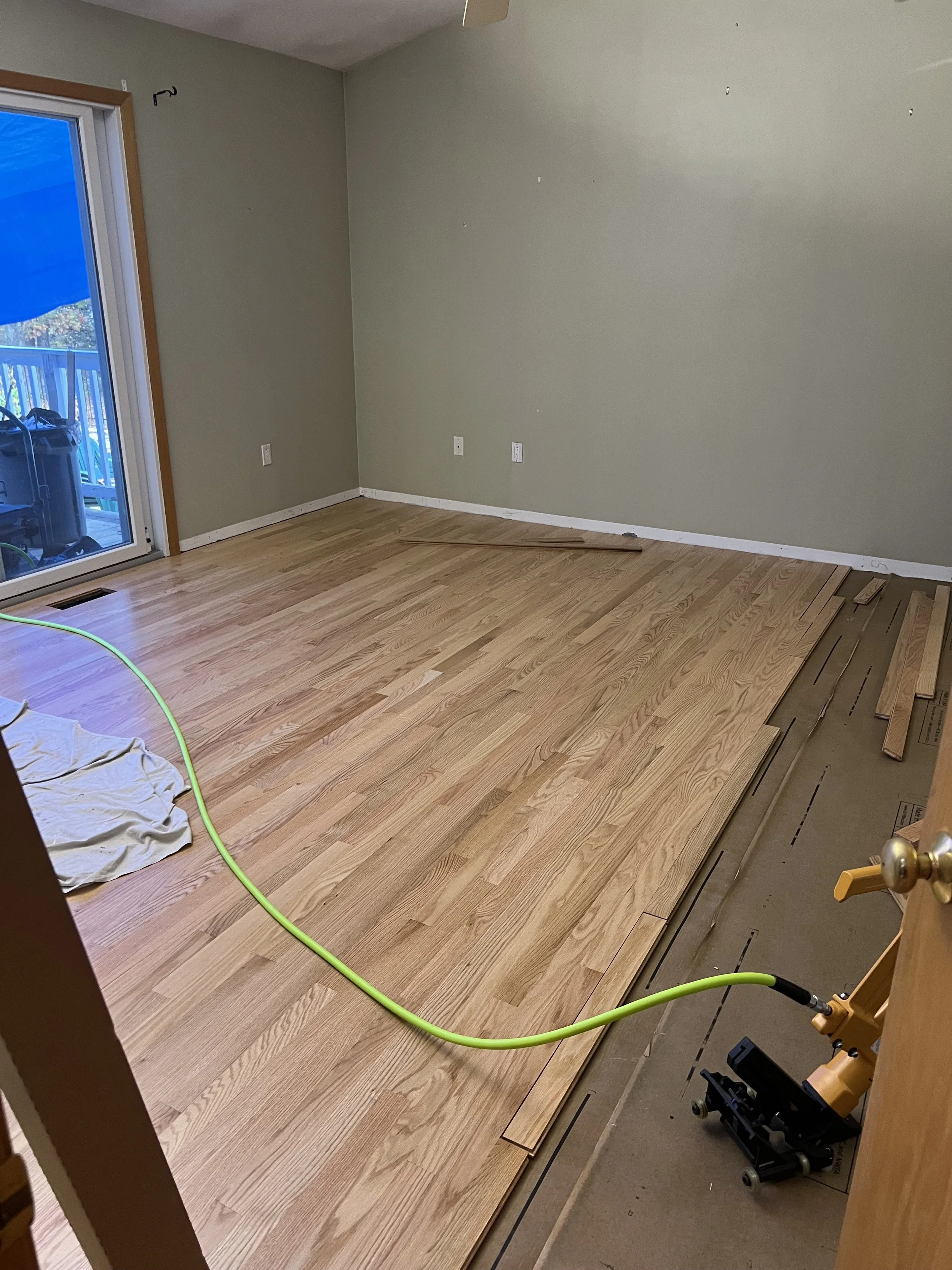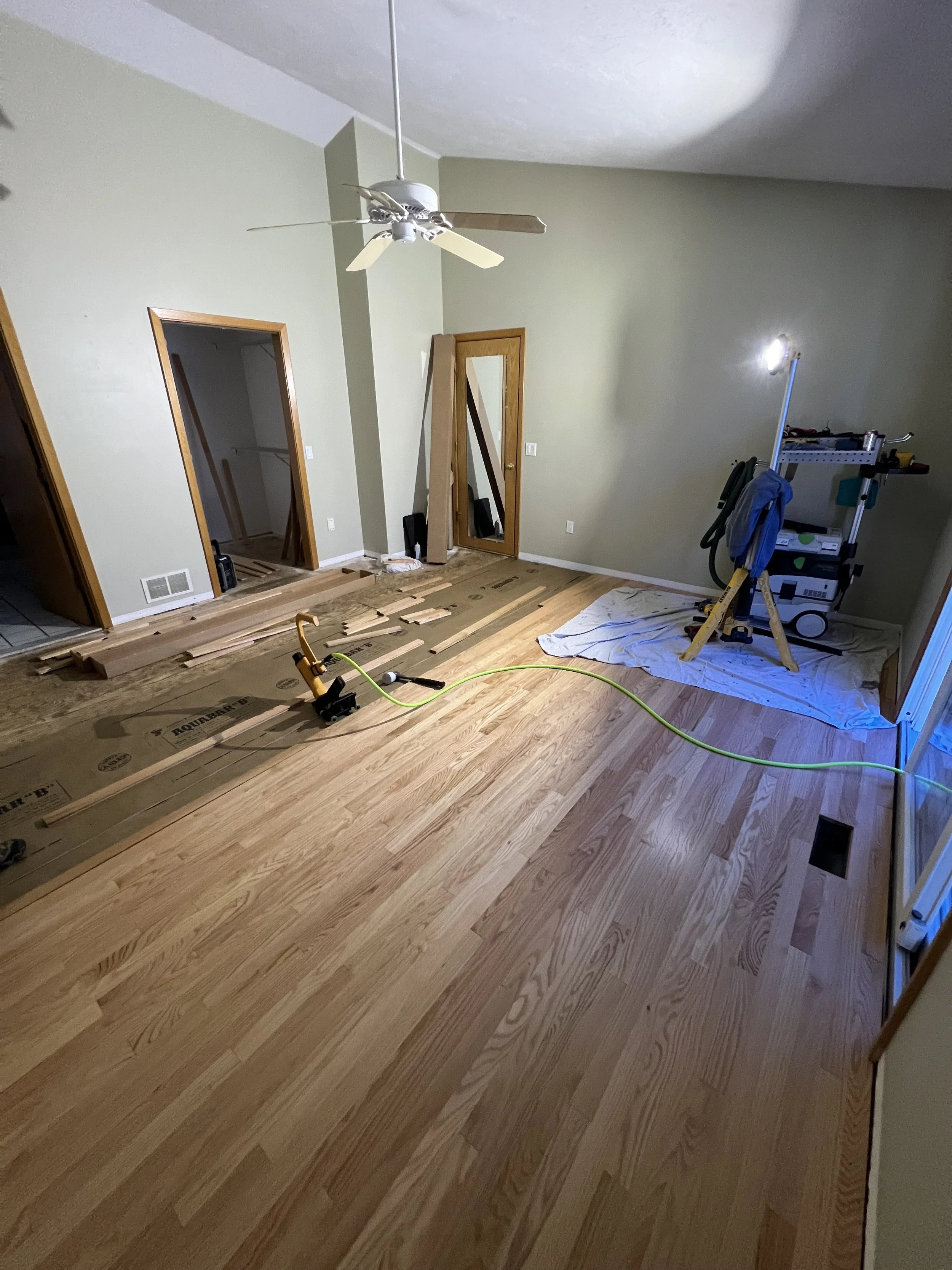This project checked all of the boxes of modernization. We removed all carpeting, staples, and trim to provide a clean slate to transform. Once all the dust was collected we installed new pre-finished square edge hardwood flooring, new trim and a farmhouse inspired accent wall. We were delighted to complete this project and hand the room back over to the homeowners.